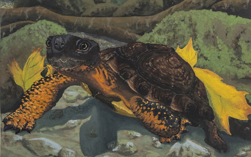 La pintura acrílica de Miranda McCleaf que representa una tortuga de madera en su hábitat acuático ganó el concurso inaugural Restore the Wild Artwork. Leer más...