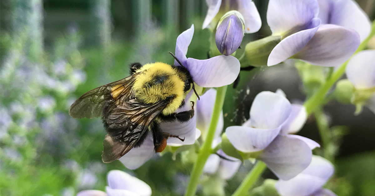 Abejorro oriental común sobre añil azul silvestre nativo (Baptisia australis). A medida que el polen se adhiere a su cuerpo, la abeja usa pelos en forma de peine en el interior de sus patas para cepillar el alimento de polen en estructuras en forma de canasta, llamadas corbiculae, ubicadas en el exterior de sus patas. Una canasta completa, vista aquí como un grupo de color naranja oscuro, puede contener hasta 1 millones de granos de polen, que luego se llevan de regreso al nido.