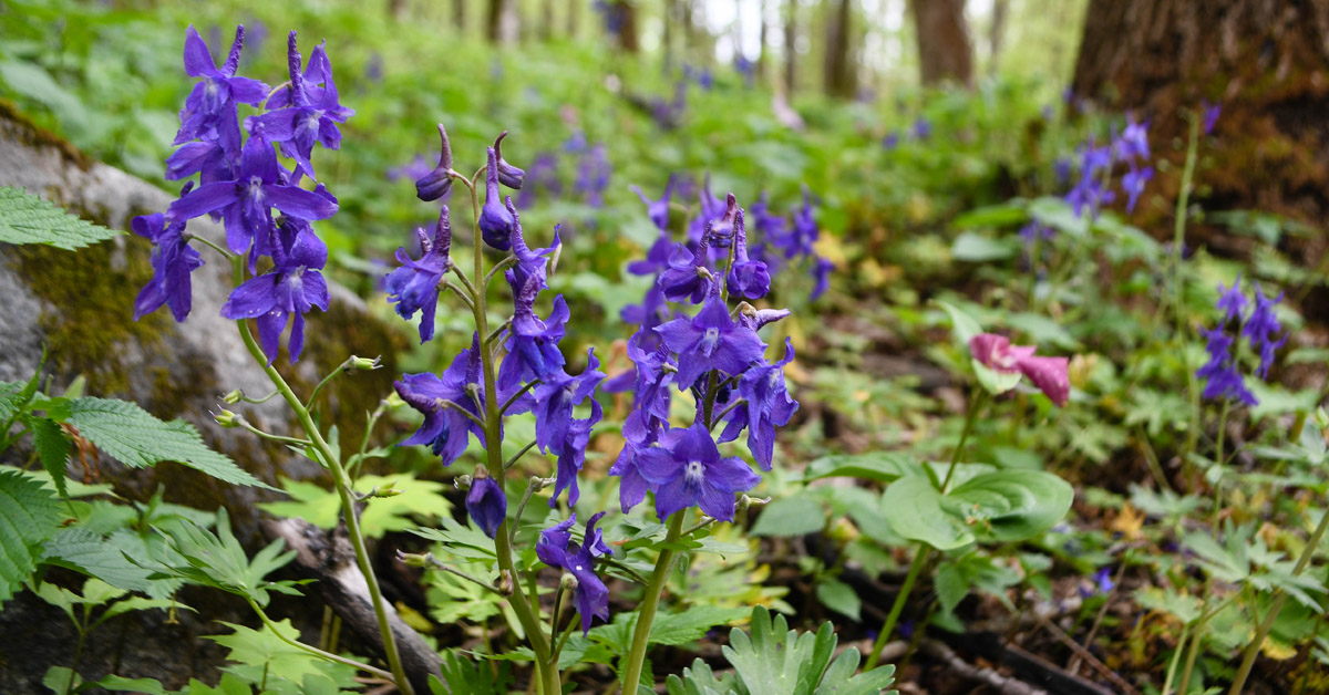 La espuela de alondra enana luce una flor de color púrpura intenso y se infiltra en grandes rodales de trillium.