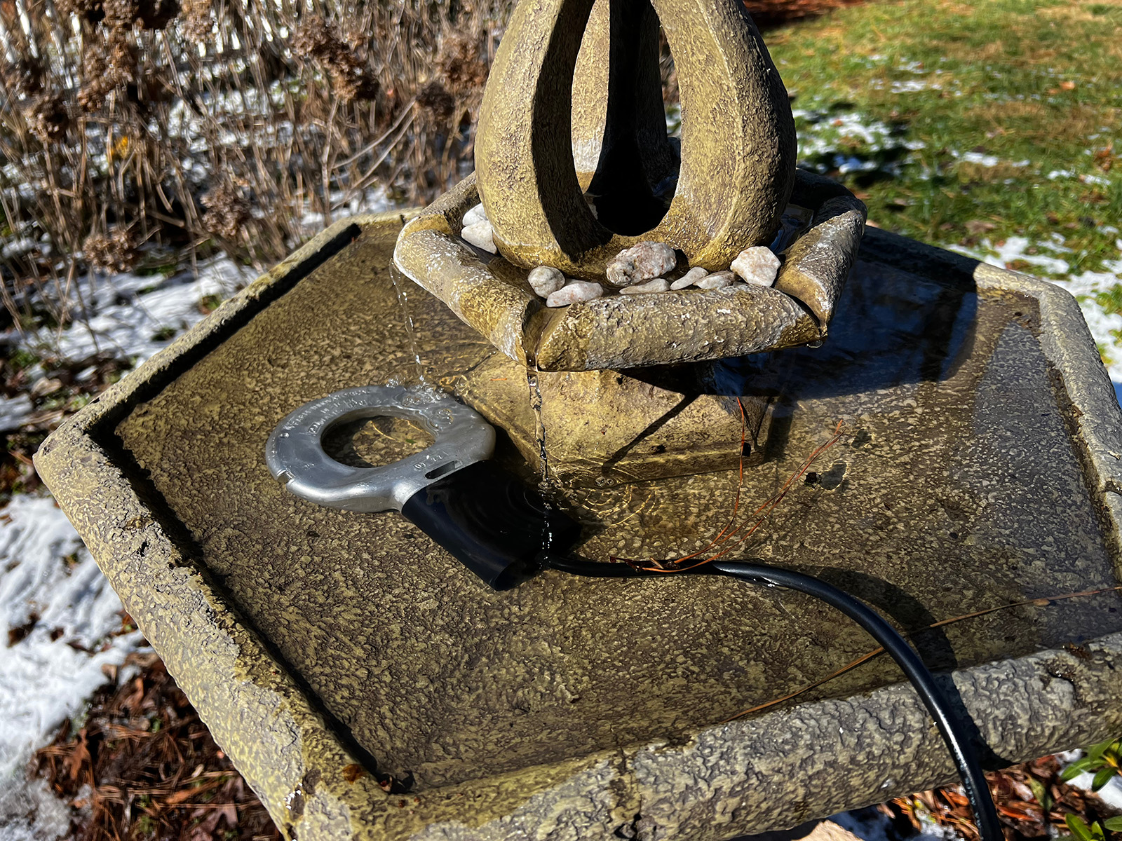 Entonces, ¿cómo se proporciona agua cuando hace tanto frío? La clave es evitar que la fuente de agua se congele. Elige una bañera para pájaros que esté hecha de materiales como plástico o resina que no se agriete. Coloca la bañera para pájaros en un lugar donde reciba la luz del sol, pero esté protegida del viento. Un baño para pájaros de color más oscuro absorberá el calor del sol, lo que también puede ayudar a evitar que se congele. Puedes agregar guijarros de color oscuro en la parte inferior si el tuyo es de color claro. Llena tu baño para pájaros tanto como puedas, porque los volúmenes más pequeños de agua se congelan más rápidamente.