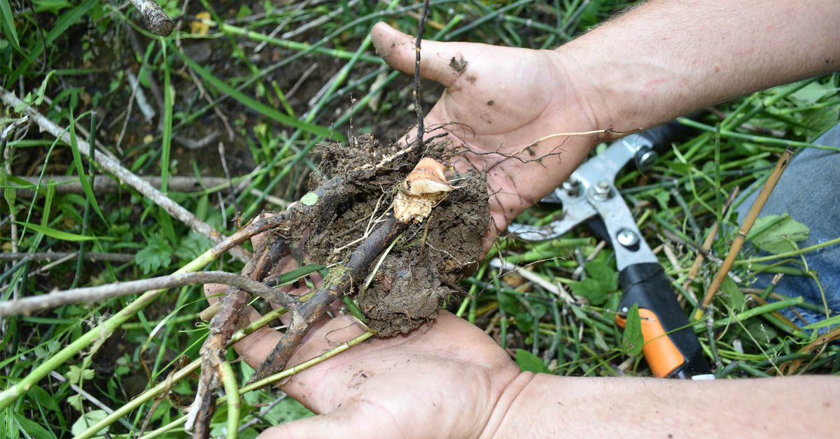 Asegúrese de matar las raíces de las plantas invasoras como estas rosas multiflora.