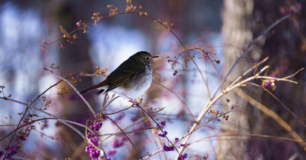 Un zorzal ermitaño posado en una baya de belleza americana, visto en el sitio VBWT del Arboreto y Jardín Botánico Edith J. Carrier.