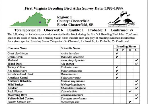 Las listas de especies y los datos del estado reproductivo ahora están disponibles para cada bloque censado en el primer Atlas de Aves Reproductoras de VA a través de la herramienta Atlas Block Explorer. Este esfuerzo se llevó a cabo de 1984a1989, por lo que han pasado casi 30 años, desde que se recopilaron estos datos. Se han producido muchos cambios en el paisaje de Virginia, lo que pone de manifiesto por qué el segundo VA BBA es tan importante para la conservación de las aves en la región. Los datos recopilados ahora se compararán con el primer conjunto de datos del Atlas para identificar cambios en las distribuciones de aves reproductoras en todo el estado. Estas distribuciones se pueden superponer con datos de uso de la tierra para ayudarnos a comprender mejor cómo las diferentes especies de aves han respondido al rostro cambiante de Virginia.