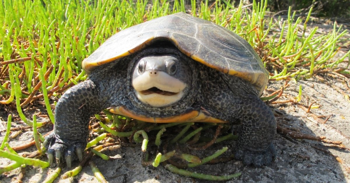 Esta tortuga dorso de diamante del norte hembra estaba en tierra en busca de un sitio para anidar. Sus "labios" son en realidad mandíbulas bien adaptadas para aplastar moluscos como los bígaros. Foto de J.D. Kleopfer/DWR