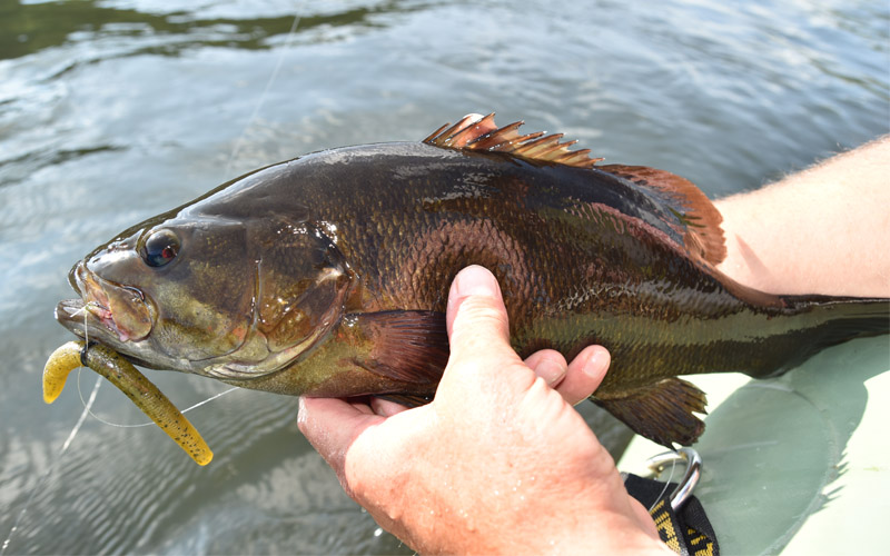 En julio de este año, me reuní con Stoudenmire y uno de sus guías, Ethan Stone, para dar un paseo de 3millas en la parte baja de New. Nuestro objetivo era pescar temprano en el día antes de que llegaran el calor agobiante y las tormentas eléctricas. Temprano en la mañana, hubo una fuerte picadura en la superficie con Britt y yo luchando contra pequeños de buen tamaño que destrozaban a los Rebel Pop-Rs y los buzzbaits. Pero nuestros mejores bocas pequeñas de la mañana llegaron más tarde, cuando Stoudenmire atrapó un 17 de 1/2 pulgada y yo desembarqué un 15 1/2 pulgada lanzando cebos de plástico a la deriva por el fondo mientras Stone nos mantenía en los mejores lugares de pesca.