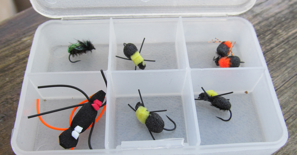 Se han identificado más de un millón de especies de insectos terrestres, superando en número a los insectos acuáticos en 20 a 1. Pero no te preocupes. Solo necesita unas pocas imitaciones comprobadas de insectos terrestres en sus cajas de moscas para tener éxito en la pesca terrestre. Tres de los principales para almacenar son los saltamontes, las hormigas y los escarabajos. Agregue grillos, saltahojas y gusanos de pulgada si desea expandir la lista.