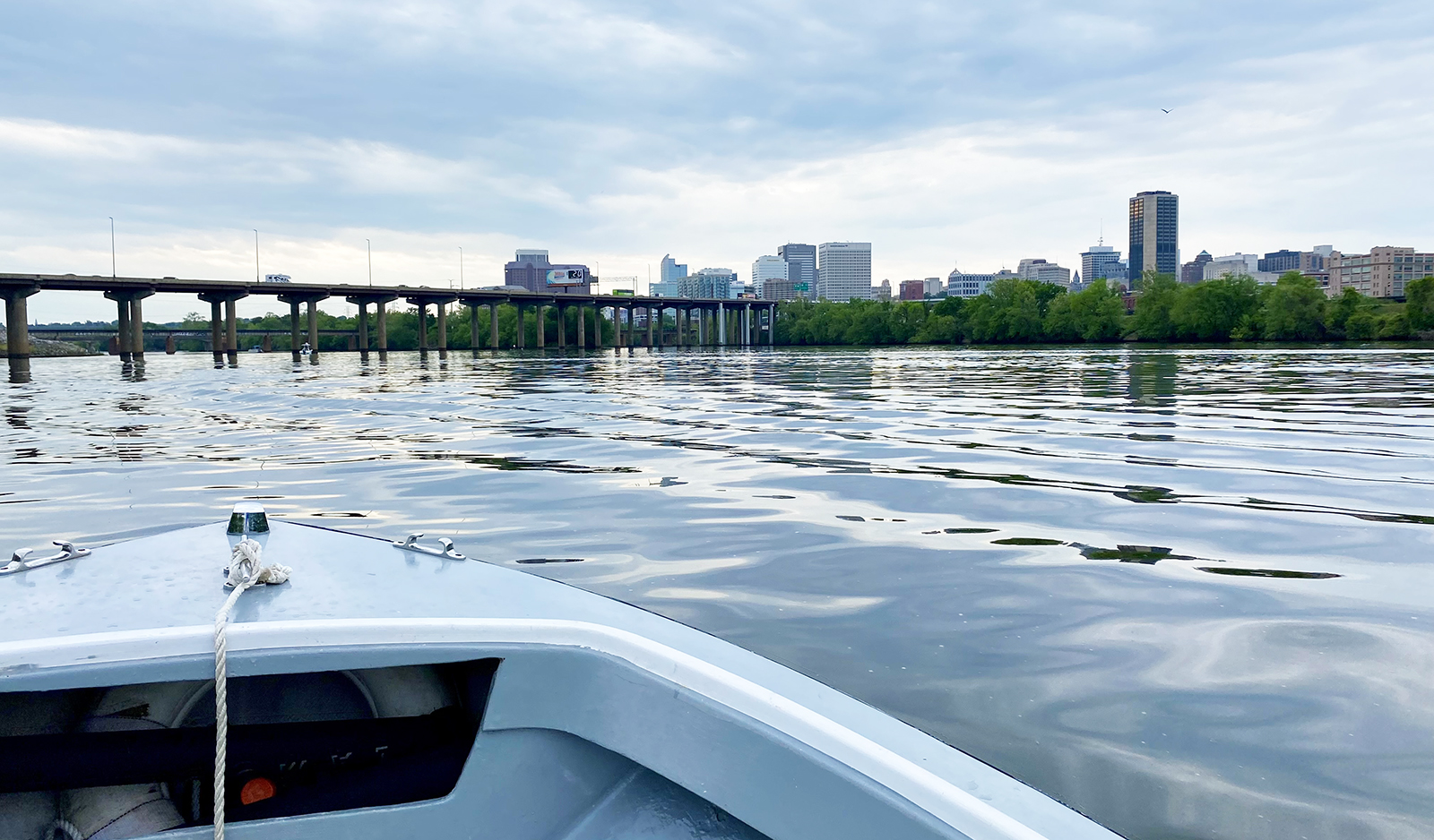 Reid y yo nos reunimos alrededor del mediodía de un día templado pero nublado de primavera a mediados de abril en Rocketts Landing, en la marea superior del río James, no lejos de la interestatal, la95y el centro de Richmond. Supuse que daríamos un pequeño paseo en bote en el esquife de Reid antes de llegar a nuestro primer lugar. Uh-uh. Nos alejamos del muelle y comenzamos a prepararnos para pescar de inmediato. Podía ver el horizonte de Richmond sin siquiera entrecerrar los ojos.