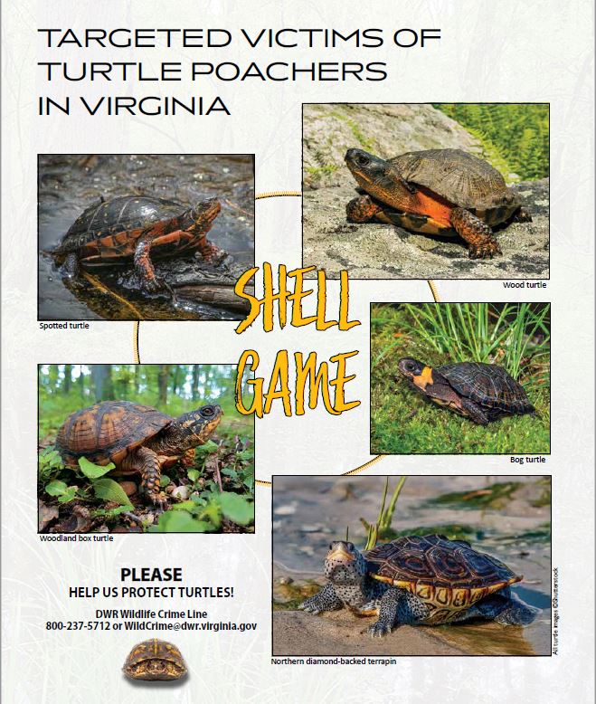 En las Áreas de Manejo de Vida Silvestre (WMA, por sus siglas en inglés) de Virginia, no es ilegal llevar estos artículos, pero es ilegal recolectar o poseer cualquier especie de reptil y anfibio de una WMA sin un permiso. Si ve un comportamiento sospechoso y cree que alguien está recolectando, poseyendo y/o vendiendo reptiles ilegalmente, comuníquese con la Línea de Delitos contra la Vida Silvestre del DWR (1-800-237-5712 o WildCrime@dwr.virginia.gov). Porque al final del día, el arma definitiva para proteger la vida silvestre de Virginia y combatir el comercio ilegal de tortugas eres TÚ.