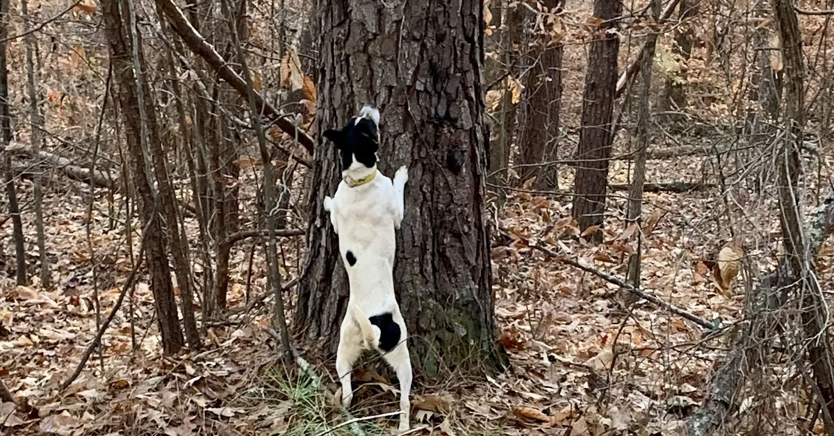 Afortunadamente, ahí es donde el... ¡tah-dah!—ardilla El perro entra. Usando todos sus agudos sentidos caninos, Trapper se adentró en el bosque en busca de ardillas, que a menudo se encontraban a una buena distancia de nosotros. Y cuando encontraba uno, se sentaba en la base del árbol, o se paraba contra él, mirando fijamente hacia el cielo. Si la ardilla se trasladaba a otro árbol, lo que se conoce como "enmaderado", Trampero rastrearía rápidamente su silueta a través del dosel del bosque.