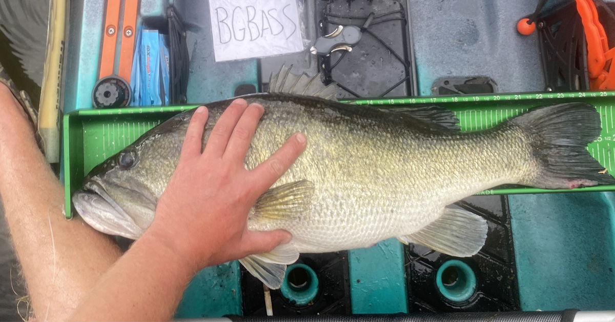 Samuel Johnson atrapó este 23.75" boca grande del lago Smith Mountain en 2022 y lo presentó al Programa de Reconocimiento de Pescadores en Línea de Virginia.
