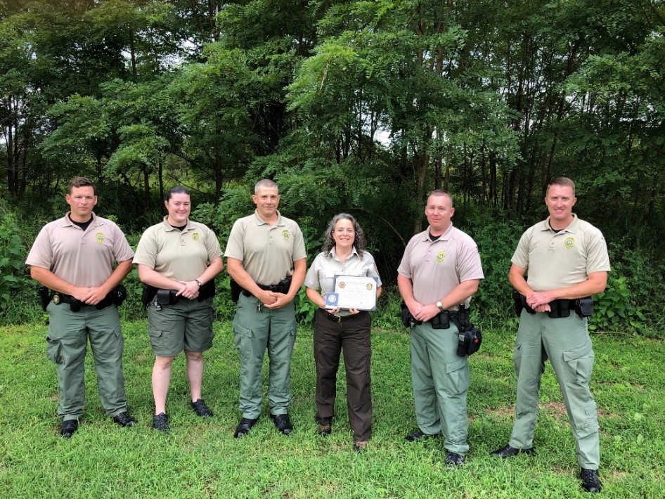 Entrega de moneda O.P.S. – La Gerente del Refugio Rappahannock de los Servicios de Pesca y Vida Silvestre de los Estados Unidos, Kendra Pendault, ha hecho todo lo posible para ayudar tanto a los oficiales del Distrito 11 como a los 16 . Kendra trabajó con el Sgto. Spuchesi para facilitar una reunión entre los Oficiales de Refugios Federales en las áreas circundantes y los Oficiales de la Policía de Conservación para reunirse sobre temas relacionados con el refugio antes de la temporada de caza. Kendra ofrece un espacio de reunión en el refugio para las reuniones mensuales del distrito. Durante la primavera de 2019 los funcionarios del Distrito 11 y 16 necesitaron una rápida reubicación de la oficina debido a las condiciones imprevistas en la oficina actual del distrito.