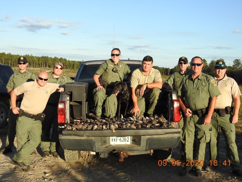 Los CPO de toda la región de Tidewater saturan un campo de palomas con cebo - El sábado 5de septiembre de 2020, los oficiales de la Policía de Conservación de Virginia de toda la región de Tidewater participaron en una operación dirigida a un campo de palomas con cebo intenso en el condado de Greensville. Durante semanas antes de la apertura de la temporada, los oficiales habían pasado incontables horas realizando vigilancia, recolectando muestras de cebo e intentando identificar a posibles sospechosos. En la mañana del día 5los oficiales se levantaron temprano y se pusieron de observación para el día. Aproximadamente a las 430 p.m., después de consultar con el oficial Kyle Jones, que era el oficial principal, el teniente Shuler y el sargento Woodruff decidieron que había llegado el momento de contactar a los cazadores. Con la ayuda de la oficial de K9 Braziel y su compañera Grace, así como oficiales uniformados de toda la región, los oficiales se mudaron e hicieron contacto.