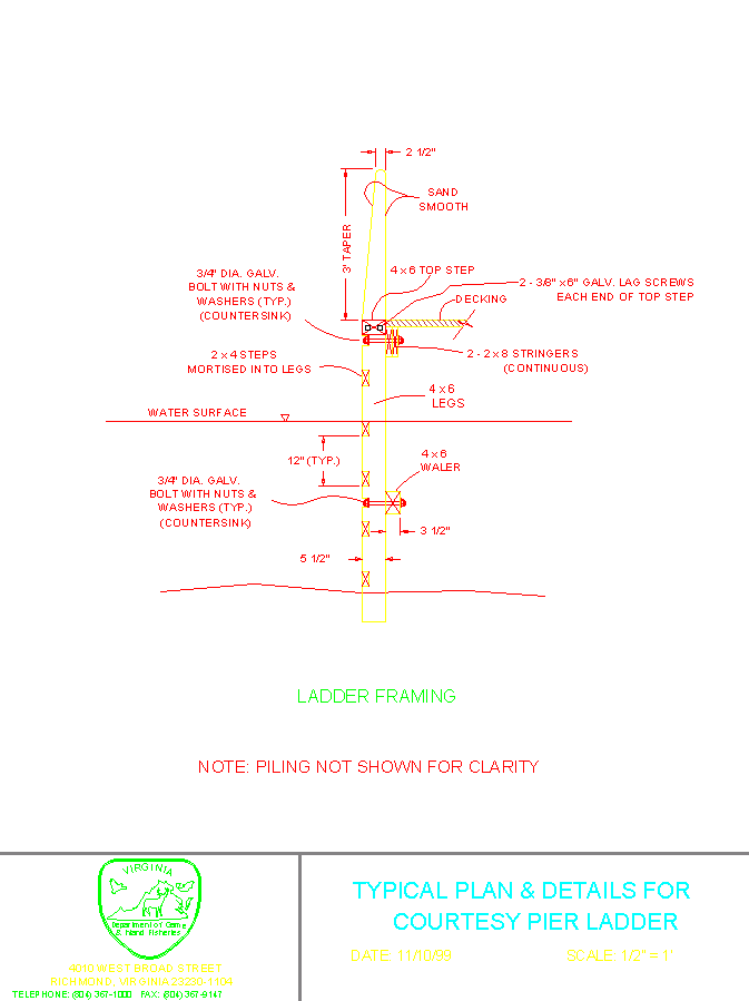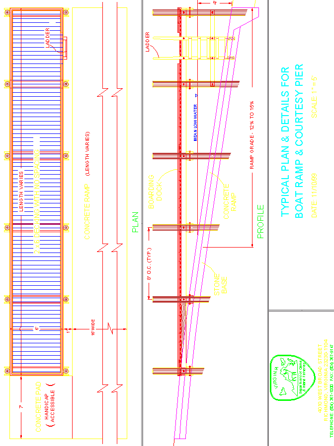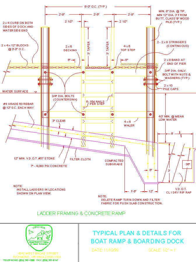 Nota: Esto suena bien pero no es práctico, en suelos arcillosos o limosos también resultará en un pilotaje inestable. Los daños causados por el hielo deben tenerse en cuenta en todas las rampas de Virginia. El hielo que fluye en los ríos y en las mareas puede ser especialmente destructivo. Si se espera que el hielo se mueva, la resistencia de los materiales debe ser mayor y el diseño debe estar fortalecido.