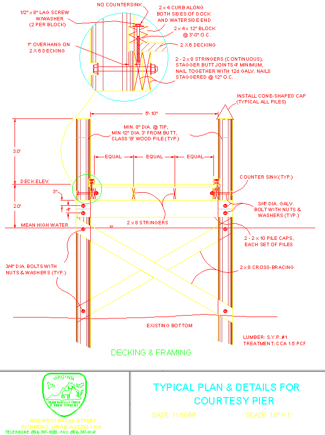 La madera para muelles debe ser tratada a presión para retardar la descomposición. Históricamente, la madera tratada con CCA (Arseniato de Cobre Cromática) ha sido el tratamiento de elección para la construcción de nuestros muelles. La Agencia de Protección Ambiental (EPA, por sus siglas en inglés) ha considerado que la madera tratada con CCA no es apta para su uso en aplicaciones donde la madera puede entrar en contacto frecuente con la piel. La madera tratada con CCA no debe usarse en agua dulce. Por esta razón, utilizamos madera tratada con CCA donde la madera está en contacto constante con agua salada, o en una condición de humedad constante, como pilotes de muelles, arriostramientos transversales, largueros de cubierta y viguetas. Para todas las aplicaciones que tienen el potencial de entrar en contacto con la piel, hemos optado por utilizar el tratamiento alternativo de cobre azol (CA) para la compatibilidad con los herrajes con recubrimiento galvanizado. La madera CCA que estará en contacto constante con agua salada debe tratarse a un nivel de 2.5 libras de retención por pie cúbico (pcf) de madera. La madera que recibirá salpicaduras de agua salada debe tener una retención de 1.5 PCF. Para agua dulce y madera en aplicaciones de agua salada que entrarán en contacto frecuente con la piel (como tablas de terrazas, pasamanos y escaleras), madera tratada con CA designada para "contacto con el suelo o agua dulce" con una retención mínima de 0.21 PCF y una retención preferente de 0.31 PCF es la madera elegida. Todos los pernos y clavos deben estar galvanizados en caliente. Cuando los herrajes entrarán en contacto frecuente con el agua salada, una mejor opción sería el acero inoxidable, ya que nuestra experiencia es que incluso los herrajes galvanizados se oxidarán con el tiempo.