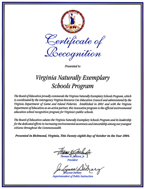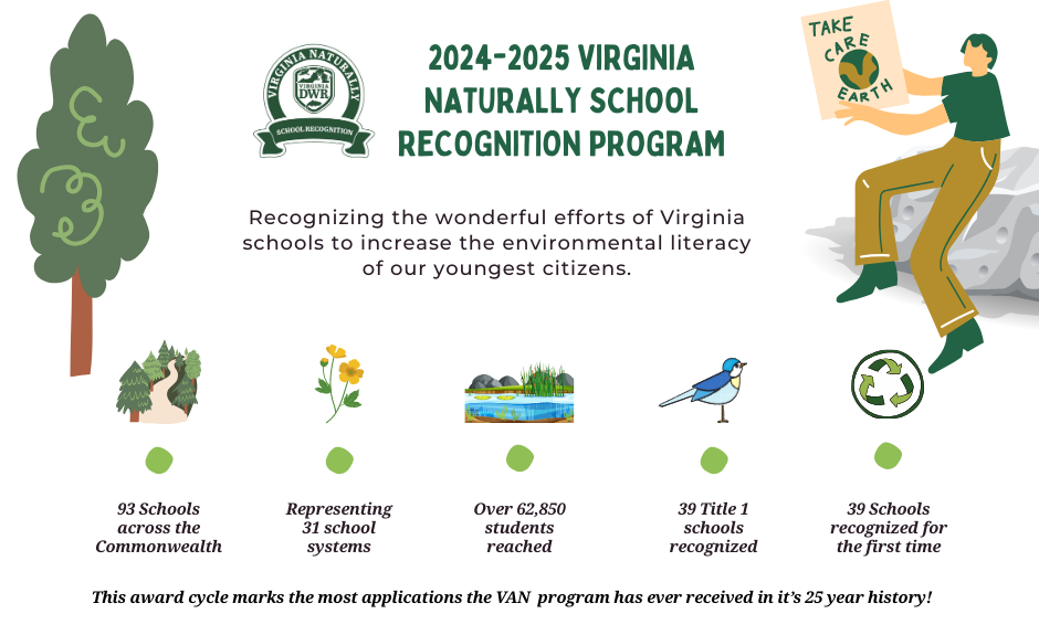 Si su escuela ha estado trabajando para incluir educación sobre el medio ambiente en los planes de estudio, DWR alienta a solicitar el Programa de Reconocimiento Escolar Virginia Naturally durante el período de solicitud abierto del 1de abril al 30 de junio de cada año. Este no es un premio único, sino uno sobre el cual puede construir y lograr reconocimientos adicionales cada año que participe. Estamos ansiosos por reconocer los maravillosos esfuerzos de las escuelas de Virginia para aumentar la alfabetización ambiental de nuestros ciudadanos más jóvenes.