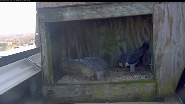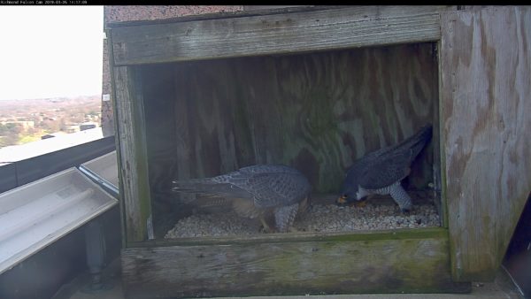 A continuación se muestra la serie de fotos que capturan la visita de la pareja a la caja nido el 5 de marzo. Las cinco fotos muestran a la hembra (izquierda) y al macho (derecha) participando en un comportamiento de cortejo con la cabeza inclinada dentro de la caja nido en el edificio Riverfront Plaza de Richmond.