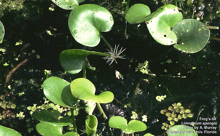 Las hojas de esta planta tienen forma de corazón, de 1/2 a 11/4 de pulgadas de largo y ancho, y los márgenes son enteros. La planta tiene bulbos esponjosos de color púrpura rojizo que ayudan a flotar.
