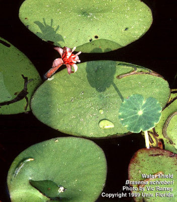 Se desarrolla a partir de raíces delgadas, negras y fibrosas ancladas en el sustrato. Una sustancia mucosa o gelatinosa recubre todas las partes de las partes sumergidas de la planta. Los tallos y la parte inferior de las hojas elípticas son de color púrpura, mientras que las partes superiores de las hojas son verdes. Las hojas pueden crecer hasta 5 pulgadas de largo y 3 pulgadas de ancho.