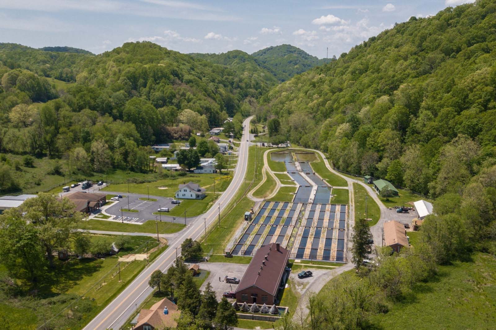 El suministro de agua para la piscifactoría consiste en agua alimentada por gravedad a través de 12"tuberías de hierro fundido procedentes de cuatro manantiales diferentes y una presa de desviación en Staley's Creek. El edificio de la piscifactoría para los alevines es completamente agua de manantial que se airea en seis torres de aluminio fuera del edificio. El agua alimentada por gravedad de Staley's Creek se mezcla con el agua del manantial al salir del edificio de la piscifactoría para suministrar las vías de producción exteriores. Esto da a la piscifactoría un volumen total de agua de aproximadamente 1500 galones por minuto. La temperatura del agua del manantial varía desde 50 grados F en invierno hasta 56 grados F en verano. La temperatura del agua del arroyo varía desde 38 grados F en invierno hasta 70 grados F en verano.