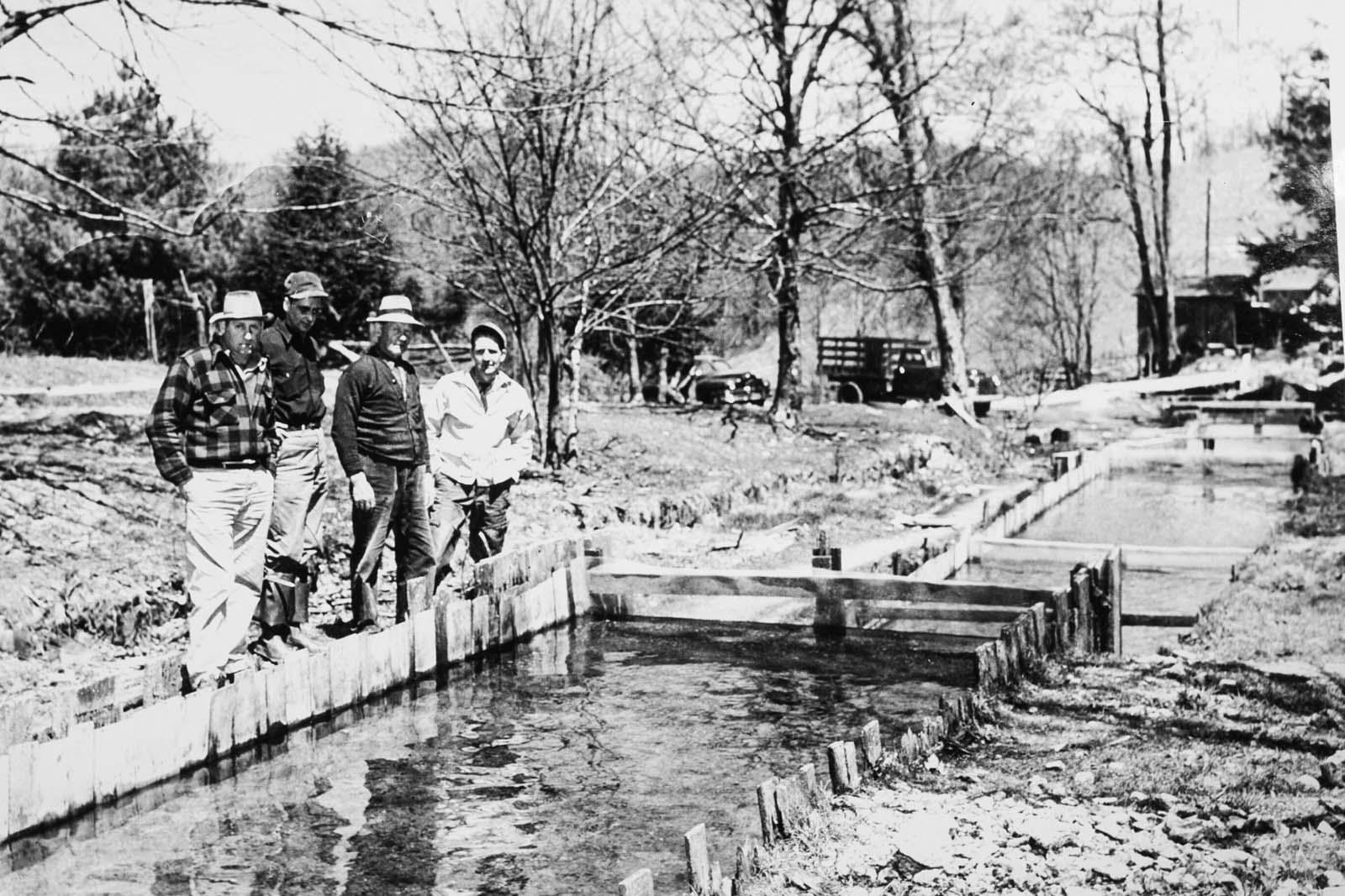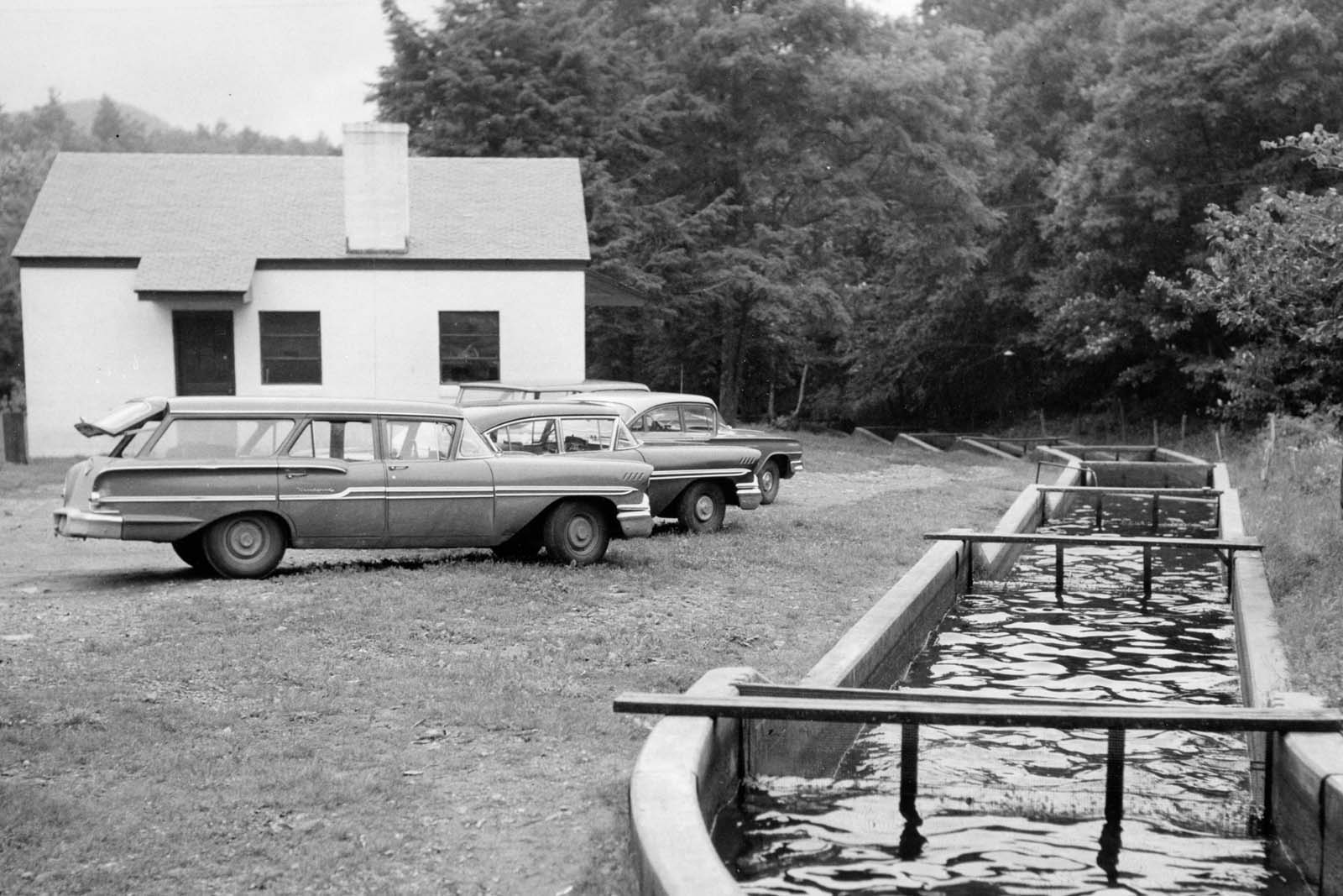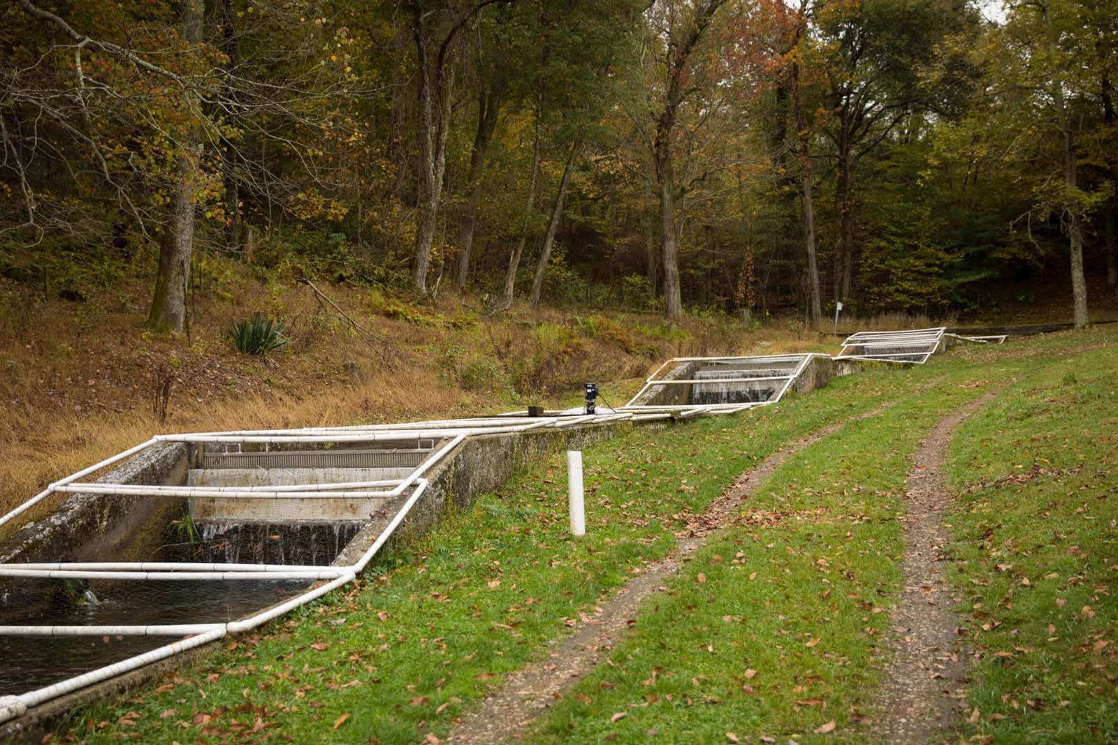 La piscifactoría Montebello funciona con manantiales, con capacidad de bombeo desde el arroyo situado bajo la instalación cuando se necesita agua excedente. La instalación original tenía pistas de tierra con laterales y extremos de madera (principalmente castaño americano). Más tarde, a principios de los años 1950, los circuitos de tierra y madera fueron sustituidos por circuitos de hormigón en una sola fila. Este diseño necesita menos agua para funcionar.