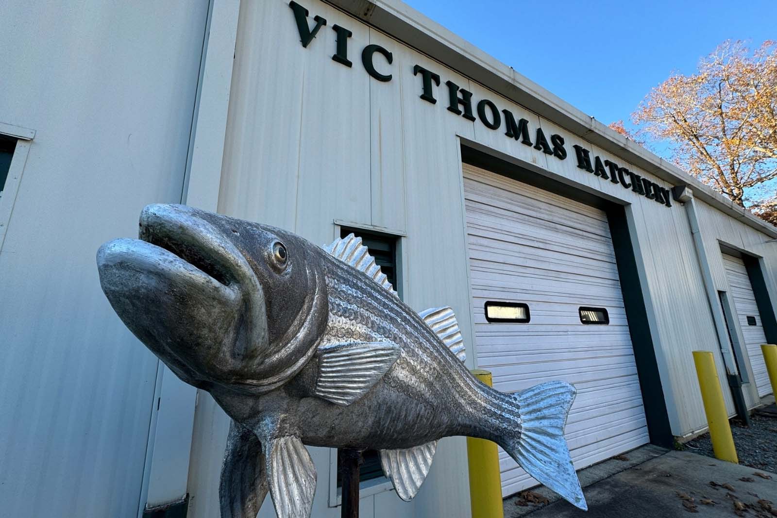 Las poblaciones de la piscifactoría alrededor de 750,000 alevinos de lubina rayada, 300,00400,000 alevinos de lucioperca, 400,000500,000 alevinos de bluegill y 50,000 cridos crappie blancos anualmente. Además, el criadero suministra a otros criaderos del Commonwealth con huevos y alevines de lubina rayada y lucioperca, según se aplicar. Situado en el centro, Vic Thomas es una instalación vital de producción y distribución para la distribución de bagre de canal para el programa de pesca urbana, así como para la distribución de carpa triploide de hierba para el control de la vegetación en aguas de la Commonwealth.