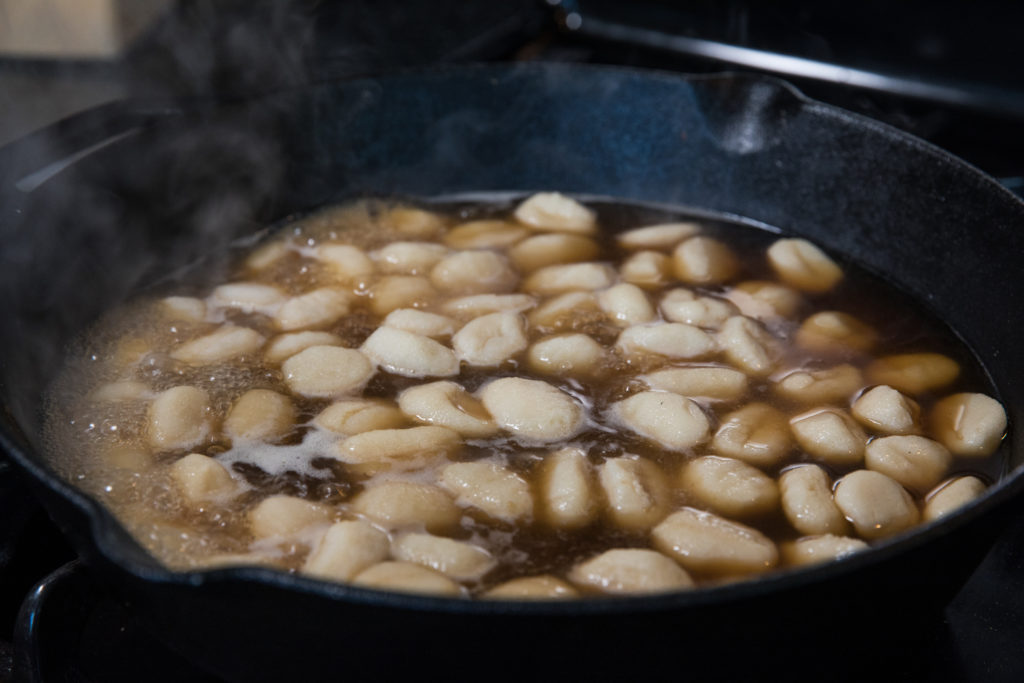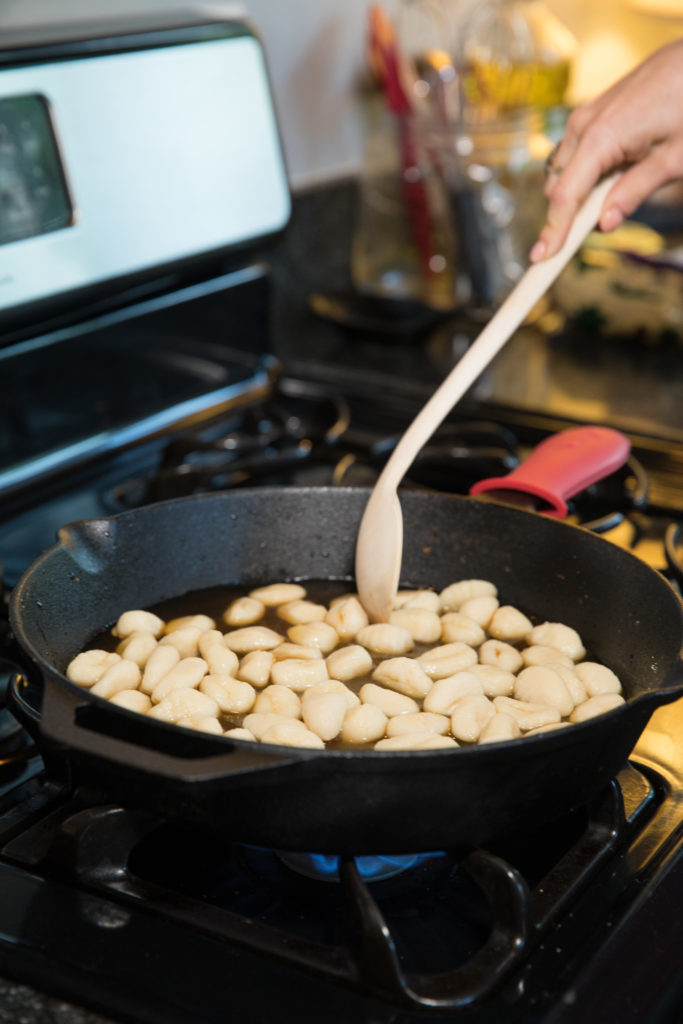 - En una sartén, cocine los ñoquis de acuerdo con las instrucciones del paquete, pero cocine en caldo de pollo en lugar de agua.