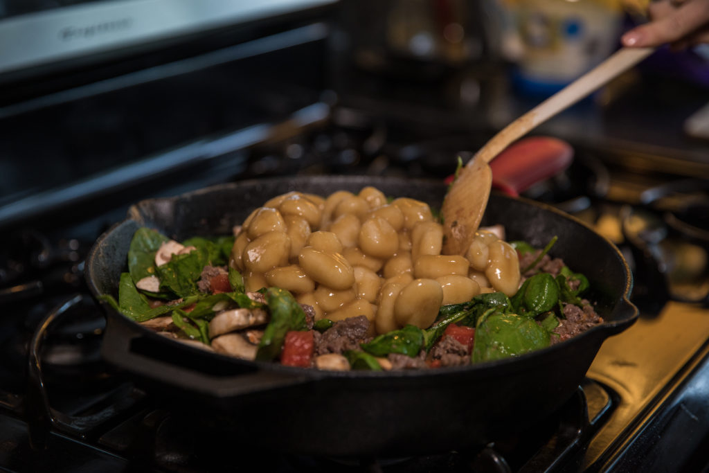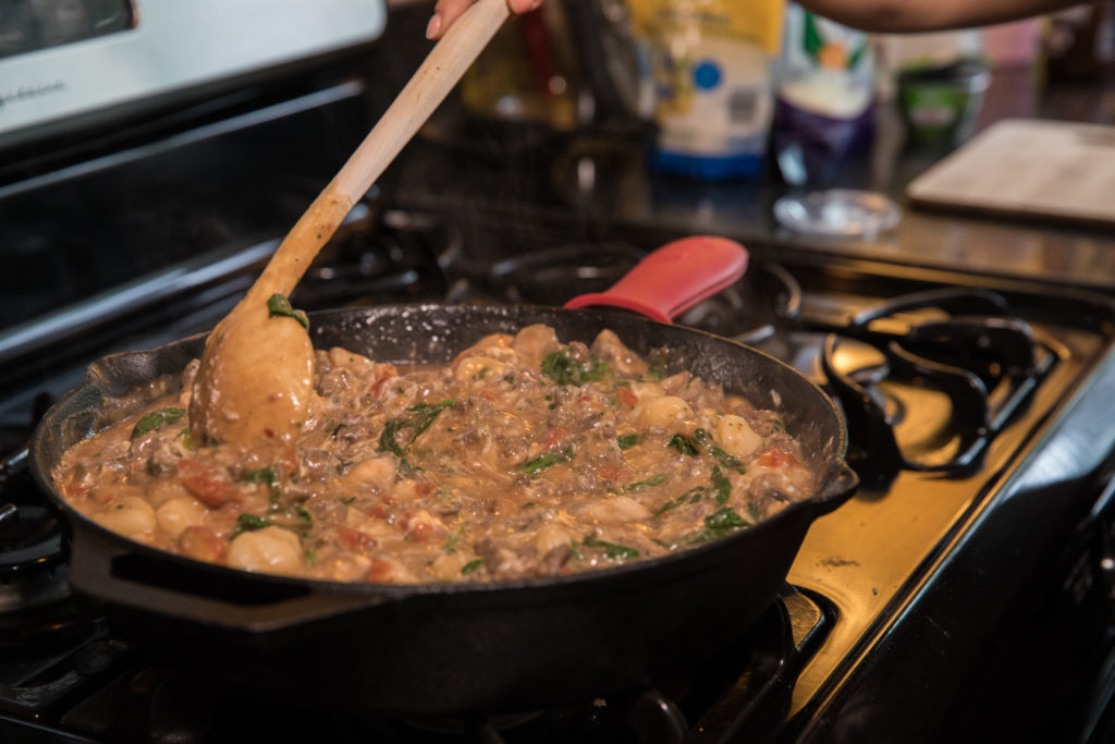 - Agregue el ajo, los tomates, los champiñones y la cebolla. Una vez que estén combinados, agregue los ñoquis.