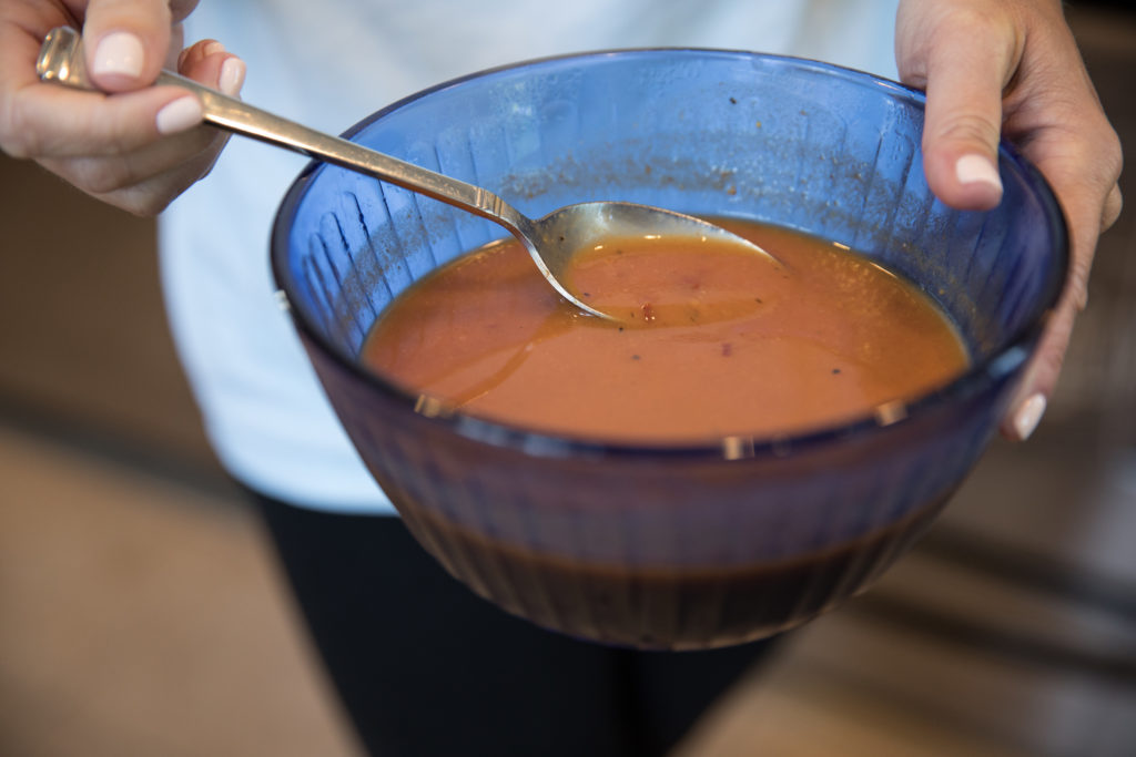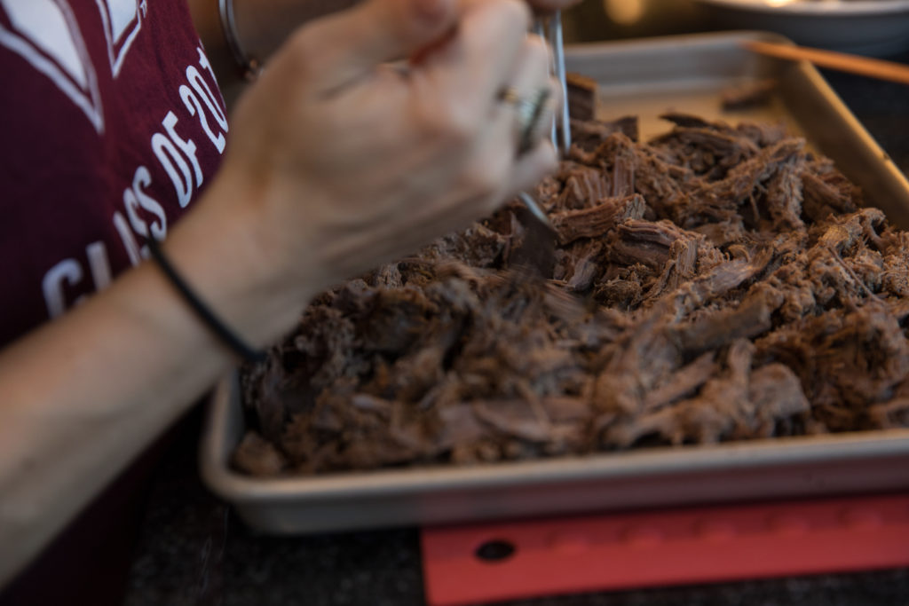 - Separe el asado hasta que toda la carne esté desmenuzada y agregue la salsa BBQ. Mezcle bien con la carne desmenuzada. Deje hervir a fuego lento durante unas horas.