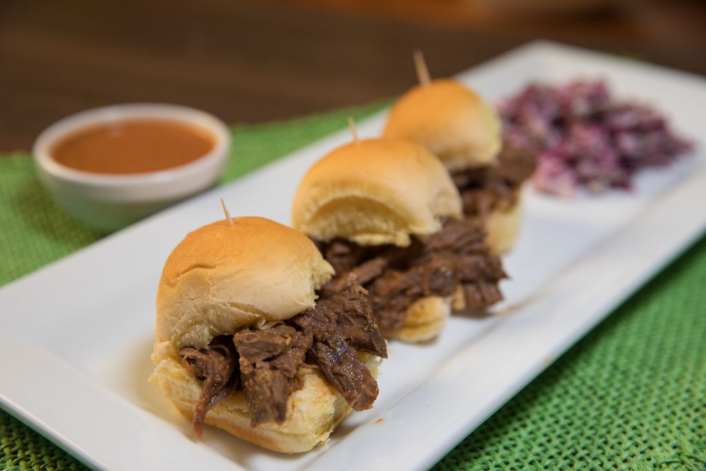 - Sirva la barbacoa en los mini deslizadores de rollos de papa y cubra con ensalada de col. Rocíe con salsa BBQ adicional.