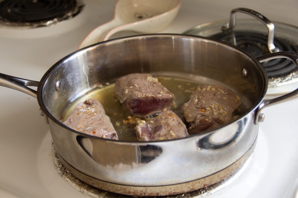 - Cocina el ajo en aceite de oliva a fuego medio hasta que se dore y puedas olerlo bien. Encienda el fuego a medio-alto y dore los filetes de lomo en la sartén aproximadamente 30 segundos a 1 minuto por cada lado. Deja los filetes de ciervo a un lado.