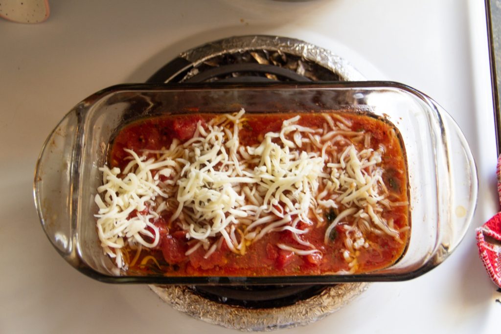 - Mueva el contenido de la sartén a un plato apto para horno. Coloque el queso mozzarella encima de los filetes hasta que estén cubiertos.