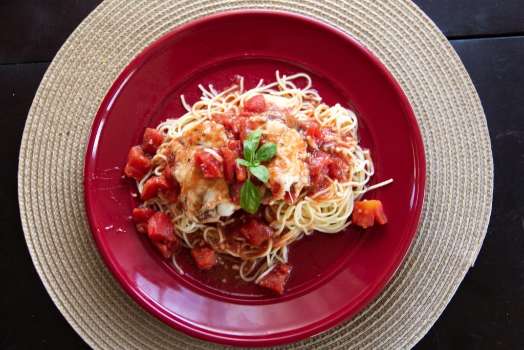 - Coloque el plato en el horno y cocine a la parrilla hasta que el queso se derrita y burbujee o esté ligeramente dorado. Sirva sobre fideos de mantequilla con pan de ajo si lo desea y cubra con albahaca fresca. ¡Disfrutar!