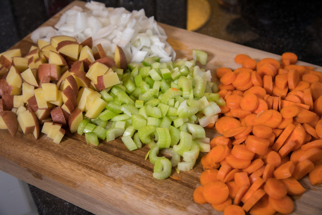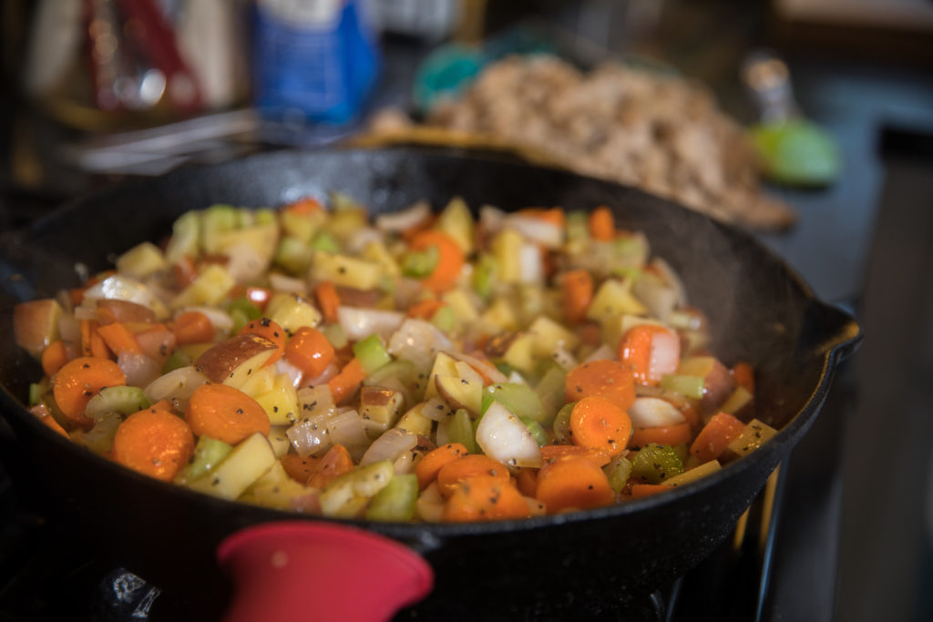 - En la misma sartén con mantequilla nuevamente, saltee las verduras hasta que se ablanden.