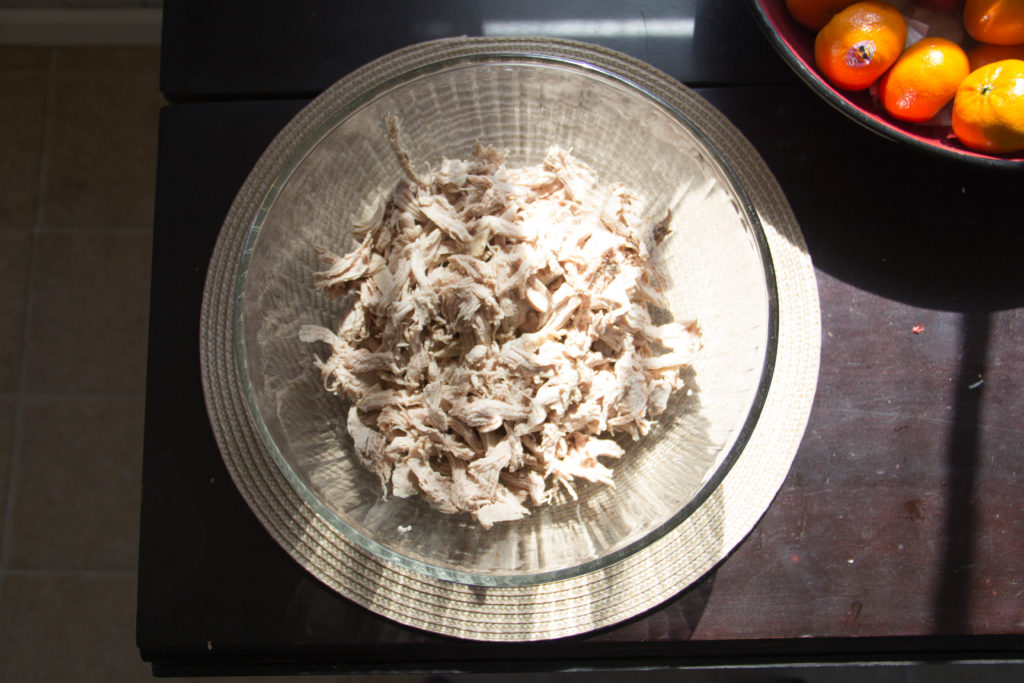 - Deja que la carne se enfríe, pero no dejes que se enfríe. Mientras la carne está caliente, triture las pechugas con un tenedor hasta que la carne esté finamente desmenuzada en bocados del tamaño comestible.
