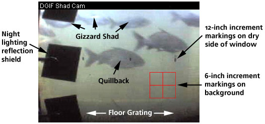 La Shad Cam se entrena en la ventana de visualización en el canal de salida de la escala piscícola. Los peces vistos en Shad Cam han ascendido con éxito por la escala de peces y están a punto de volver a entrar en el río James aguas arriba de la presa.