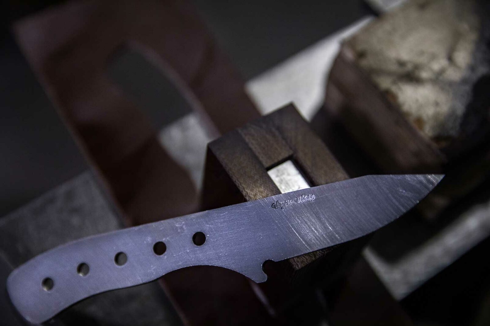 "Todos nuestros cuchillos y fundas están fabricados en Richmond con materiales de primera calidad. Realizamos todo el tratamiento térmico en casa y fabricamos nuestra propia especialidad en acero de Damasco".