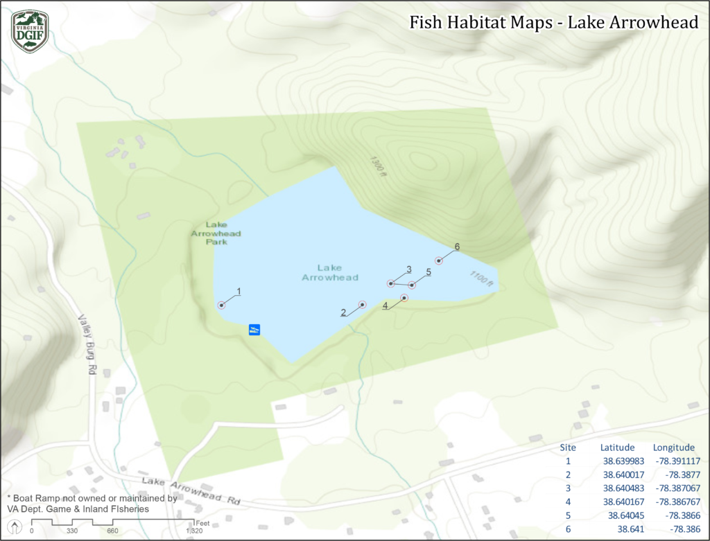 Lake Arrowhead es un embalse de 39 acres ubicado en el condado de Page, cerca de Luray, Virginia. El lago fue construido en 1971 por el Servicio de Conservación de Suelos del USDA como un embalse de control de inundaciones. El lago es propiedad de la ciudad de Luray y el Departamento de Recursos de Vida Silvestre de Virginia administra la pesquería. El lago Arrowhead se encuentra al pie de las montañas Blue Ridge y ofrece una magnífica vista del valle de Page. Las orillas inclinadas gradualmente, el agua relativamente clara y una profundidad máxima de 43 pies describen mejor la composición física del lago. La cuenca del lago fue despejada de toda estructura durante la construcción, lo que hizo que la estructura submarina fuera escasa.