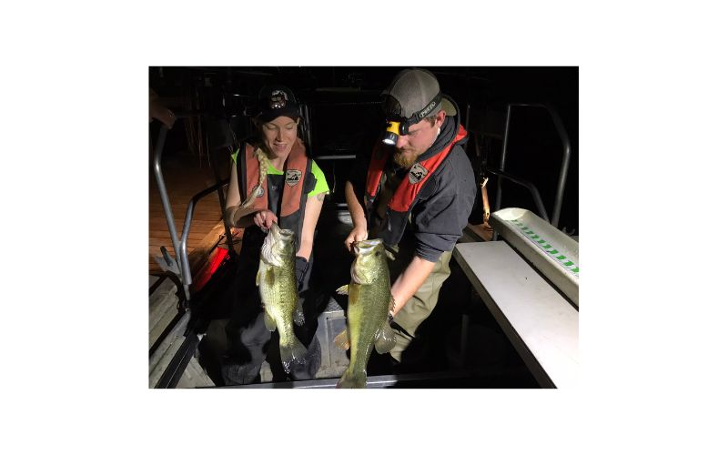 La población de lobina negra es excelente, con muchos peces en el rango de 2a4 libras disponibles para los pescadores. Históricamente, el lago Frederick ha producido la mejor calidad de pesca de lobina negra en el valle de Shenandoah. Los pescadores han luchado con bocas grandes de hasta 10 libras del lago en los últimos años. Algunos de estos bajos trofeo también han sido liberados para luchar otro día. La reproducción parece ser muy estable, y un buen número de lubinas 12-18" representan la mayor parte de la pesquería. En comparación con las lubinas de latitudes más meridionales, las lobinas del lago Frederick exhiben tasas de crecimiento lentas. Se necesitan alrededor de 6 temporadas de crecimiento para que una lubina alcance 14" en el lago Frederick. El forraje principal para la lubina negra son numerosas agallas azules pequeñas y mojarras negras. El hecho de que Frederick produzca lubinas de hasta 10 libras es una prueba de que una especie de forraje pelágico no necesita estar presente para cultivar peces grandes. El agua clara del lago Frederick a menudo dificulta la captura de lubina. Las lubinas a menudo quedan suspendidas en la madera sumergida que rodea gran parte de la costa. Los pescadores necesitan pescar a diferentes profundidades hasta que localicen peces. La pesca nocturna durante los meses de verano también puede ser productiva. Algunas de las lubinas más grandes se capturan durante el pre-desove en los meses de marzo y abril.