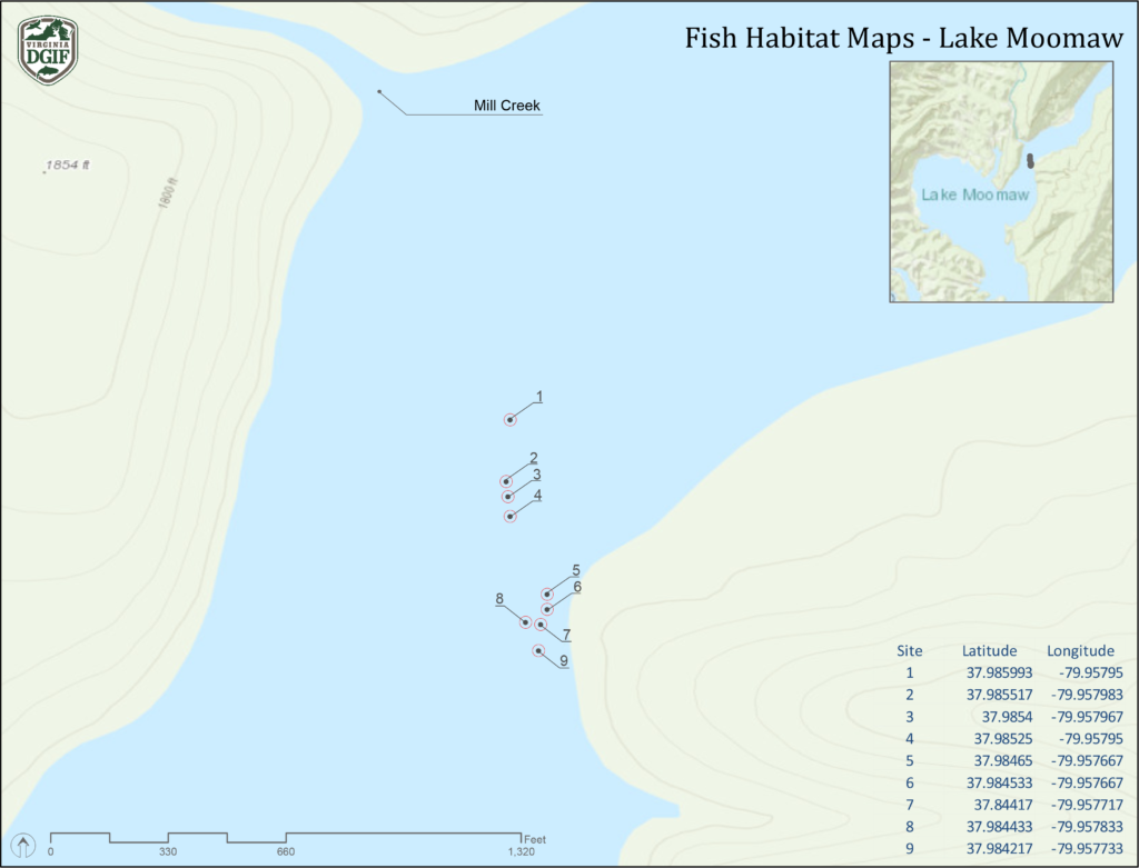 El otro método de mejora del hábitat de los peces en el lago Moomaw es agregar una estructura de aguas poco profundas para especies como el black bass, el crappie, el bagre y el pez luna. A finales del verano, cuando el lago a menudo desciende 10 pies o más, los pescadores pueden detectar fácilmente la mayor parte de esta cubierta de peces. A lo largo de los años, el Departamento y el Servicio Forestal de los Estados Unidos han cooperado con los clubes locales de lubina, la Liga Izaak Walton de América, los Boy Scouts y otros ciudadanos voluntarios para mejorar el hábitat de los peces del litoral (costa). Los tipos de hábitat que se han instalado a lo largo de los años han sido bastante variados, pero ambas agencias ahora se enfocan en colocar materiales naturales (maleza, árboles, troncos y rocas) en el lago Moomaw. Además, se ha plantado botoncillo en algunas de las llanuras estériles con éxito mixto. En 2001, alrededor de 250 árboles de Navidad de pino blanco se hundieron en la parte superior del lago para atraer lubinas y mojarras. Los planes futuros son continuar con los atractores de maleza, así como los árboles de bisagra que se cortan y talan de la orilla.