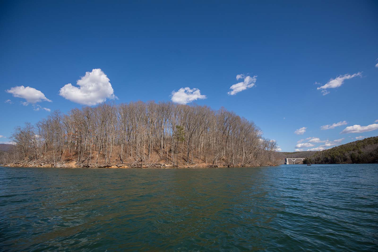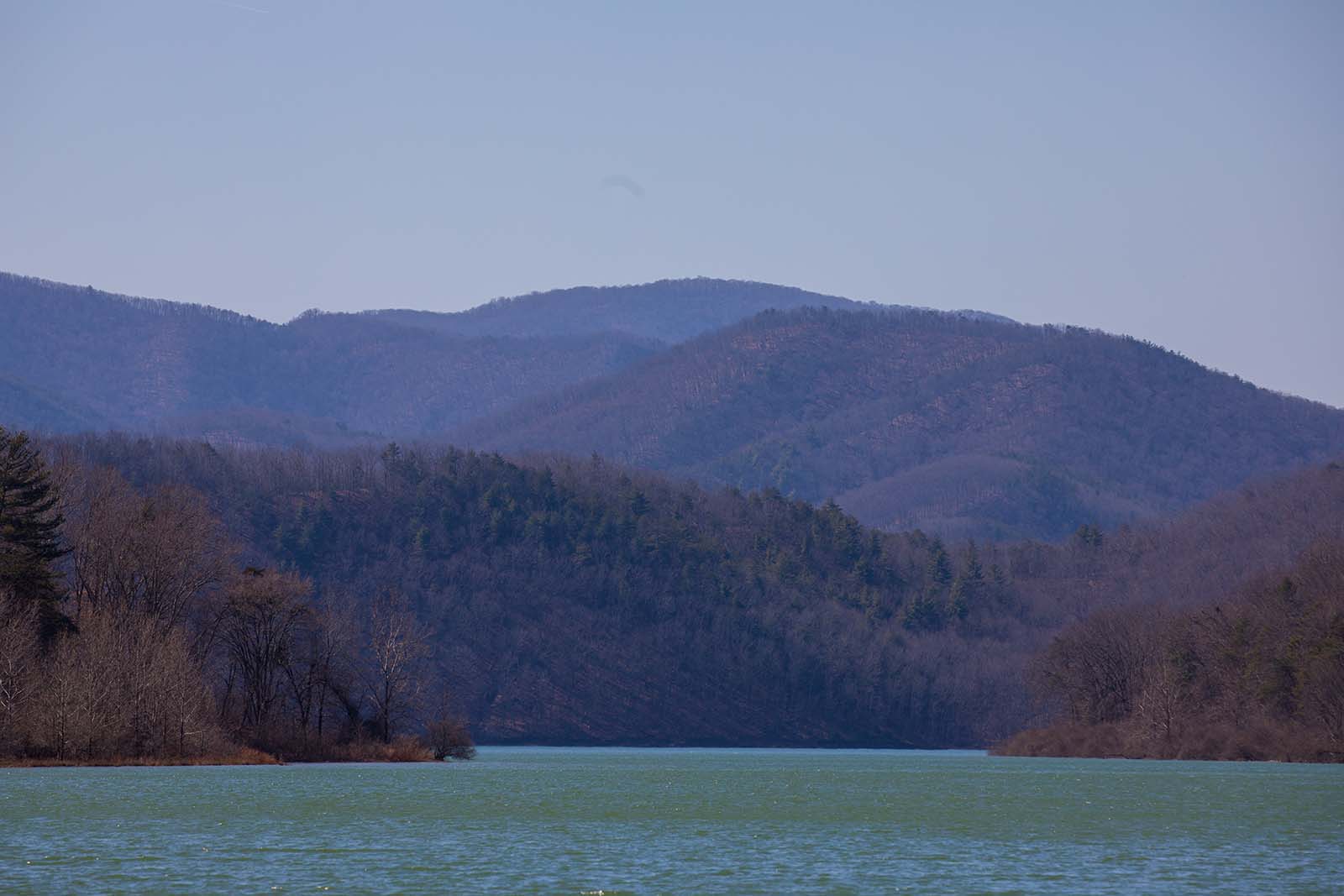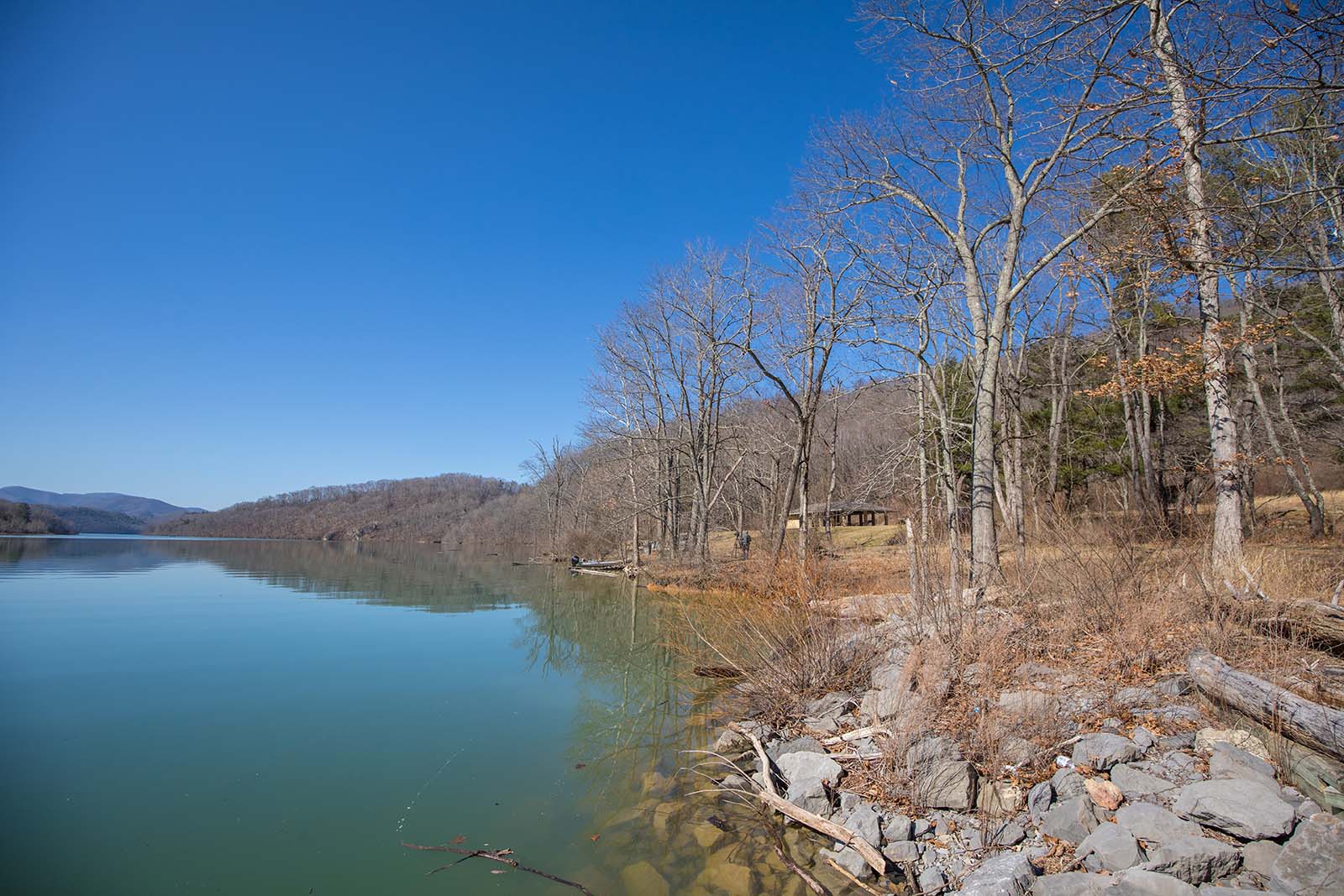 El lago Moomaw es el segundo embalse más grande del oeste de Virginia. Cubre 2,530 acres de superficie y tiene una profundidad máxima de 152 pies. El embalse se "reduce" entre 10y15 pies al año, comenzando lentamente en junio y alcanzando su nivel más bajo generalmente en septiembre. Hay 43 millas de costa boscosa sin desarrollar.