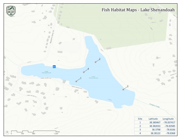 El lago Shenandoah es un embalse de 36 acres propiedad del Departamento de Recursos de Vida Silvestre. El lago se encuentra en el condado de Rockingham, cerca de la ciudad de Harrisonburg, lo que brinda una experiencia única al aire libre dentro de un entorno urbano. Gran parte del lago es poco profundo (menos de 3 pies) y la profundidad máxima cerca de la presa es de 25 pies. Los pescadores tienen la oportunidad de pescar lobina negra, agallas azules, mojarras, carpas comunes, bagres de canal y almizcles del lago Shenandoah.