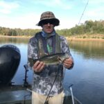 Los piqueros de cadena son abundantes en el embalse de Little Creek. El Coordinador de Educación Acuática de DWR, Alex McCrickard, con un pickerel de cadena de noviembre en la caña de mosca. Foto de: Meghan Marchetti