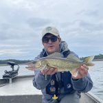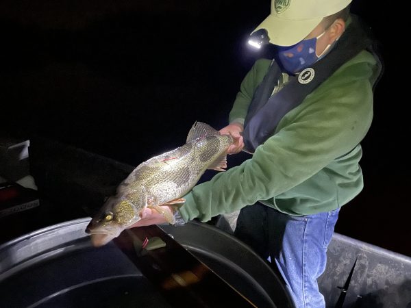 Scott Herrmann, biólogo pesquero del DWR, con un 7.2 libras que Saugeye encontró durante una inspección de pesca eléctrica el 9de marzo de 2021 en el embalse de Little Creek.
