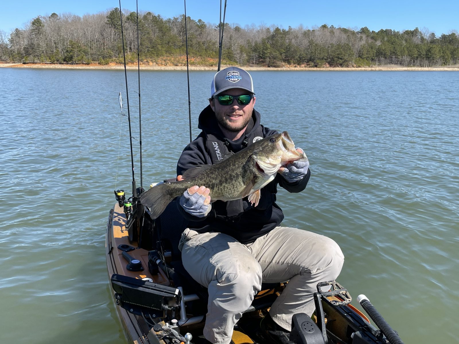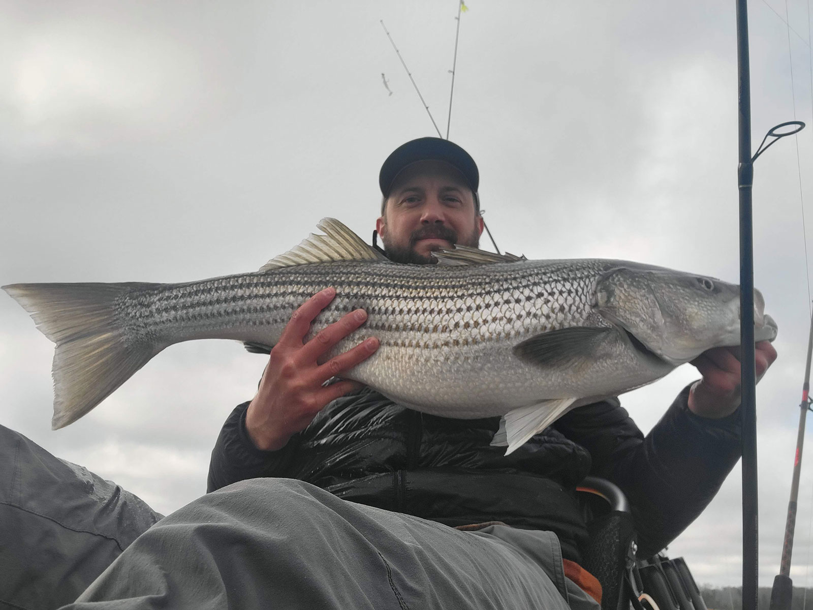 El pescador Derek Merricks con una lubina rayada que pescó en el embalse de Little Creek.