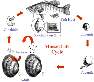 El ciclo de vida del mejillón de agua dulce es uno de los más complejos e interesantes del mundo animal. A diferencia de otros animales que pueden buscar activamente pareja, el mejillón sedentario depende de la corriente del río para reproducirse. El proceso comienza con el macho liberando esperma y la hembra ubicada aguas abajo atrayéndolos a través de su sifón de corriente indirecta. Con cientos de miles de 100óvulos, los huevos fertilizados se convierten en gloquidios dentro de sus branquias. Una vez maduros, se liberan en la columna de agua para comenzar la segunda parte de sus vidas: se adhieren a las branquias, aletas o escamas de los peces de agua dulce. En este punto, el proceso se complica aún más porque los gloquidios no solo tienen que encontrar un pez, sino que tienen que ser una de las pocas especies de peces específicas para que el ciclo de vida continúe. Si un gloquidio se adhiere a la especie de pez correcta, se enquista en el tejido del pez y sufre una corta vida como parásito.