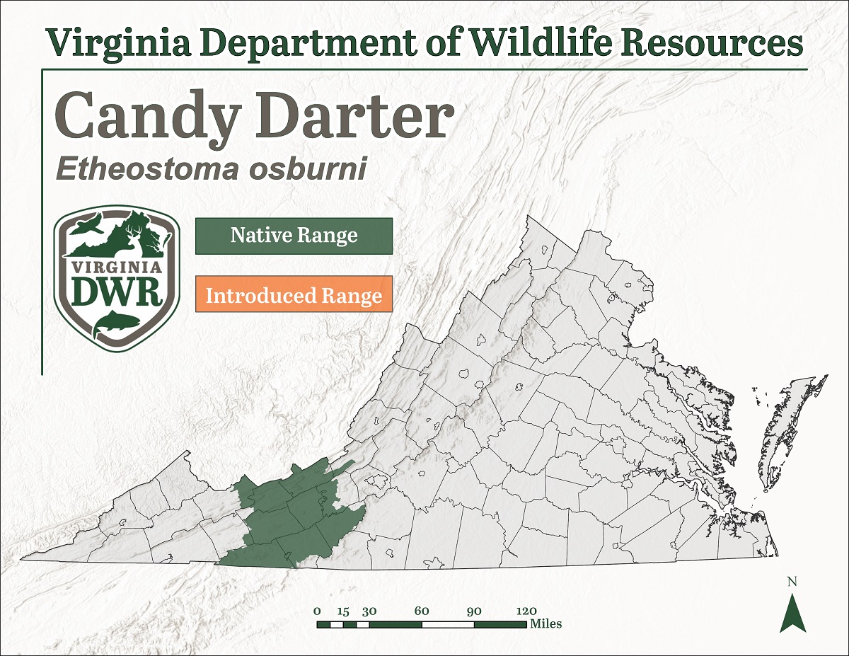 Dentro de Virginia, el Candy Darter solo es endémico de la cuenca del río New en la región suroeste del estado.