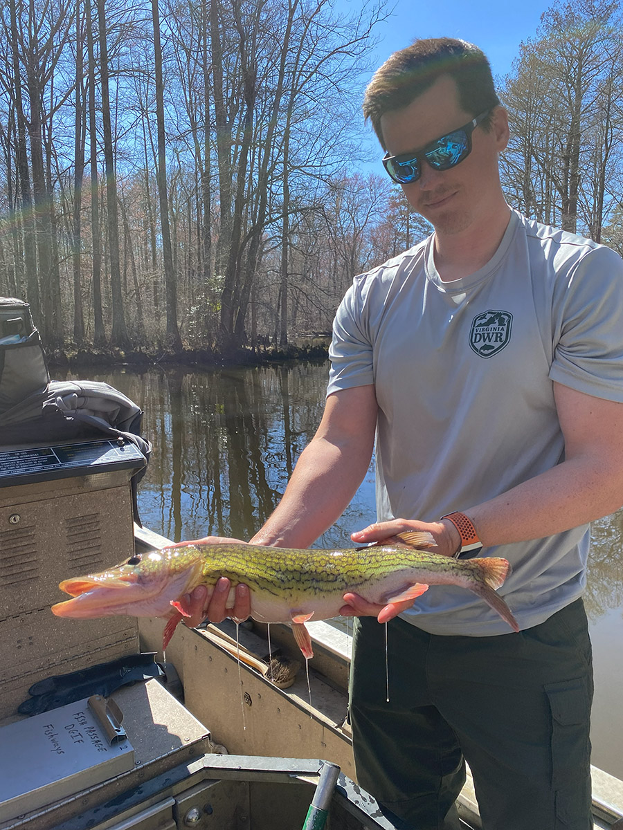 El maestro pescador de Virginia, Grant Alvis, muestra un Chain Pickerel del tamaño de una citación capturado con una rana de superficie.