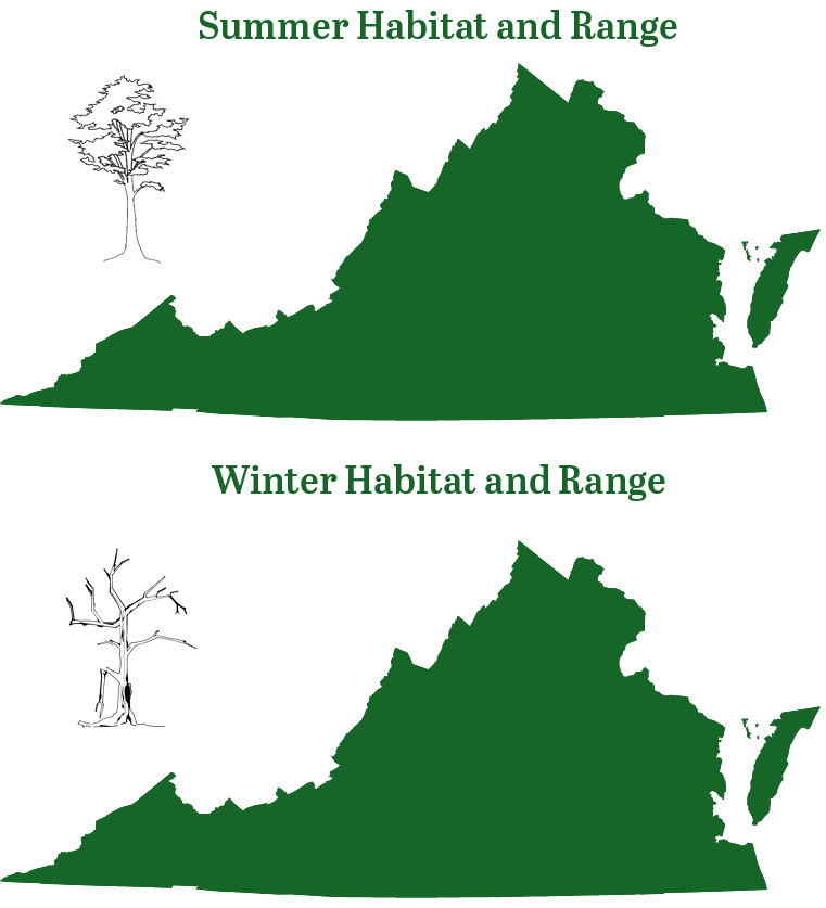 El murciélago rojo oriental se encuentra en todo Virginia y, por lo general, migra en el otoño desde su área de distribución de verano en el norte para invernar en el sur.