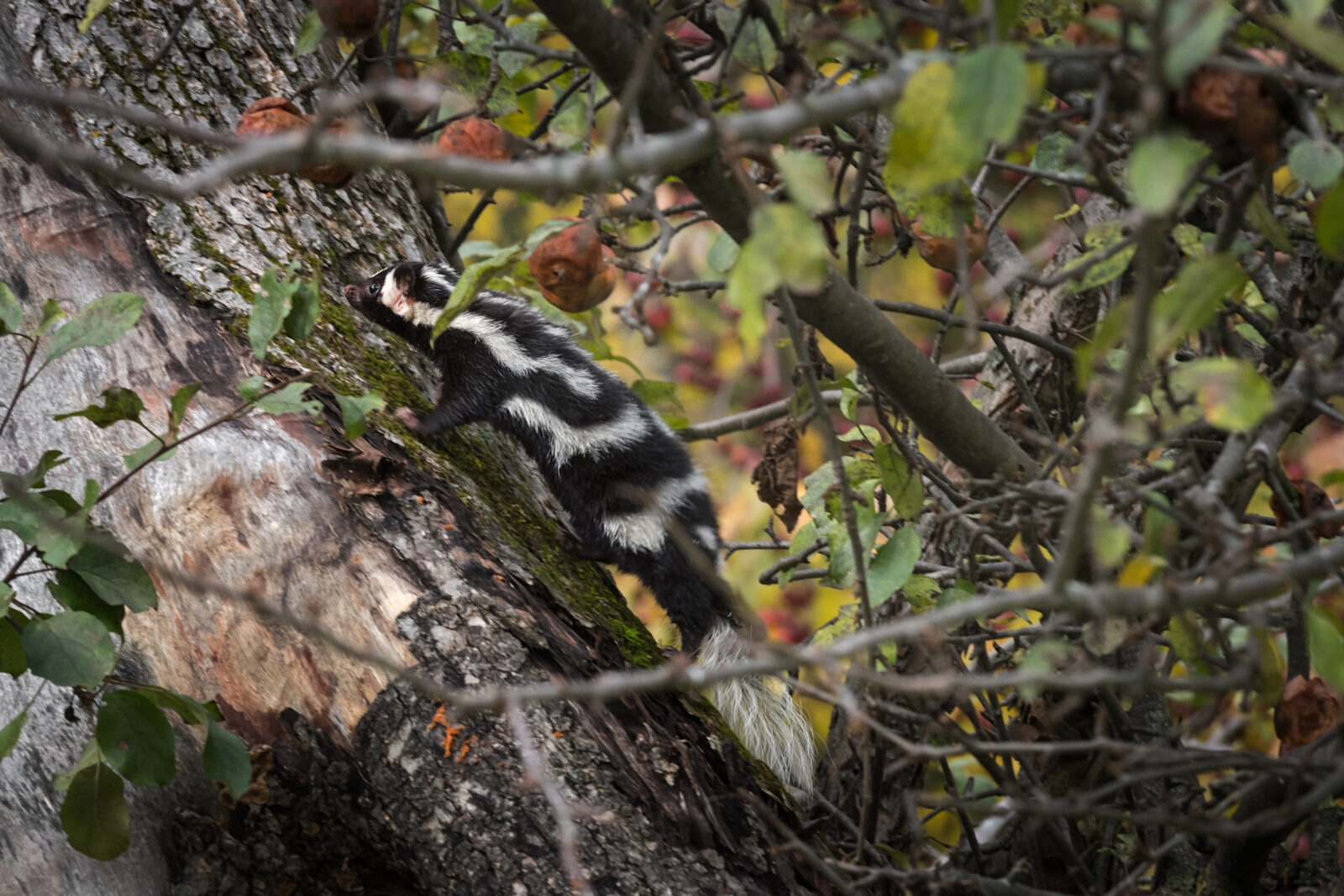 Mofeta manchada trepando por un manzano. Foto por Shutterstock.