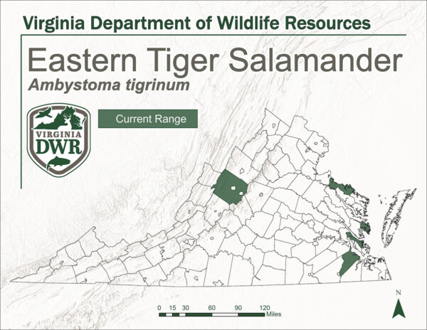 Las salamandras tigre orientales actualmente tienen dos poblaciones distintas en Virginia. Una población se encuentra en la llanura costera, mientras que una población más remanente de linaje antiguo se encuentra en Ridge y Valley.